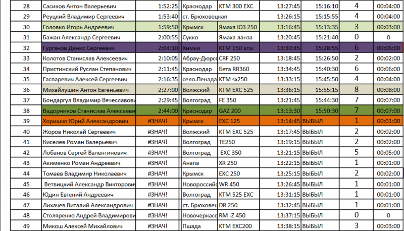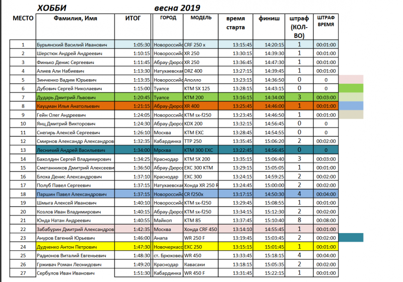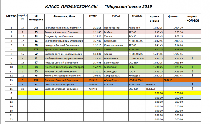 Здесь вы сможете пообщаться в компании эндуристов со всего края и России. В программе любимая вами эндуро-гонка , конкурсы на мотоциклах. Отличная возможность отдохнуть всей семьей и получить удовольствие от любимого спорта. Регламент Фэста Цели и Задачи: Развитие и популяризация мотоциклетного спорта, способствующего укреплению здоровья нации, воспитанию здорового и технически грамотного подрастающего поколения, повышение спортивного мастерства, выявление сильнейших спортсменов. Формат мероприятия неофициальный. Участники соревнований. Классы. Участники делятся на три класса . 1) Любители = Мотоциклы софт класса до 250кубов + кроссы до 150 кубов. Исключение KLX300, DRZ400, XR400, XR650 и подобные. В класс Любители запрещено записываться призерам прошлых годов в этом классе. Исключение составляют ветераны свыше 50лет и девушки. 2) Хобби = Любые мотоциклы хард и софт класса + кроссы от 150 кубов Призеры в хард классах на нашем и других эндуро соревнованиях а также по мотокроссу не имеют права записываться в этот класс. За нарушение дисквалификация. При выяснении инцидента после завершения мероприятия, запрет на участие в дальнейшем. 3) Профессионалы = Любые мотоциклы хард и софт класса Примеры распределения мотоциклов: Любители: Питбайки, кроссы до 125куб Honda xr250 Yamaha ttr250 Serow225 XT600 Сrm 250 XR400 Kayo T4 Suzuki Dr200-250 и тд. Хобби: Любые мотоциклы Профессионалы: Любые мотоциклы Расписание: 4 мая 2019 года (суббота): 8:00 —10:30 Запись участников. 10:30 Открытие Фэста. Брифинг с участниками. 11:00 Заезд класса Любители, старт индивидуальный с интервалом 30 секунд. Количество кругов будет объявлено на брифинге. Продолжительность заезда максимум 1ч 30 мин. 12:30 Заезд класса Хобби старт индивидуальный, с интервалом 30 секунд. Количество кругов будет объявлено на брифинге. 14:00 Заезд класса Професионалы. Продолжительность заезда максимум 1ч 30мин. Старт индивидуальный, с интервалом 30 секунд. Количество кругов будет объявлено на брифинге. 16:00 Подведение итогов. 16:30 Награждение. 17:00 Развлекательная программа. Правила 1) К участию допускаются только совершеннолетние участники. 2) Заявится участник может только в один заезд, поехать во втором возможно только вне зачета. 3) Пробный круг разрешен после регистрации и получения номера. Опоздавшие на старт автоматически стартуют в конце списка. Проводить отдельный брифинг для тех кто хочет посмотреть круг организаторы не будут. 4) Замена мотоцикла в течении заезда запрещена. 5) Несовершеннолетние могут участвовать только в сопровождении родителя либо сопровождающего. Никаких исключений для уникальных детей сидящих на мотоцикле с пеленок не будет. Регалии с прошлых соревнований на решение организаторов не повлияют. 6) В базовом лагере и прилегающей дороге скорость передвижения на мотоцикле 5км/ч, участник попавшийся за нарушение будет дисквалифицирован. 7) Принять участие в Фэсте может любой желающий. Условие наличие соответствующего мотоцикла и полной экипировки (шлем, мотоботы, черепаха, наколенники) 8: Экипировка обязательна, без экипировки к участию не допускаем. 9) При себе в заезде нужно иметь сотовый телефон, бутылку питьевой воды или гидратор. Судья будет проверять наличие на старте. 10) В пределах ста метров лагеря присутствуют искусственно построенные препятствия, которые обязательны к прохождению каждым участником, за объезд либо выез