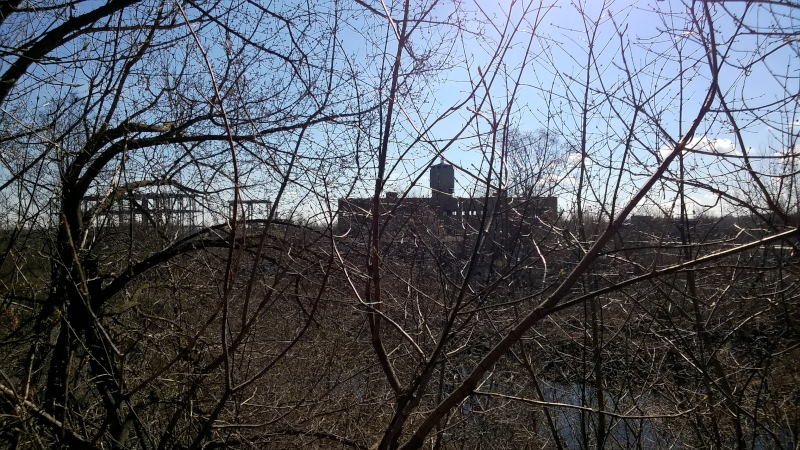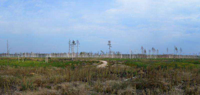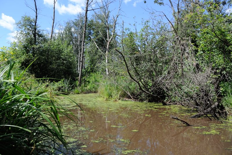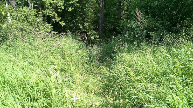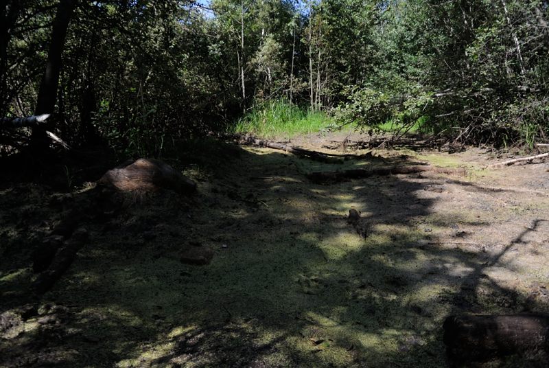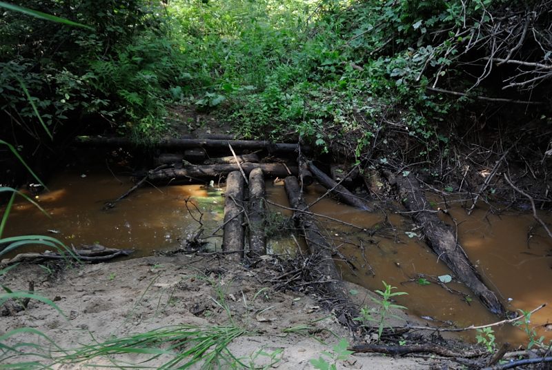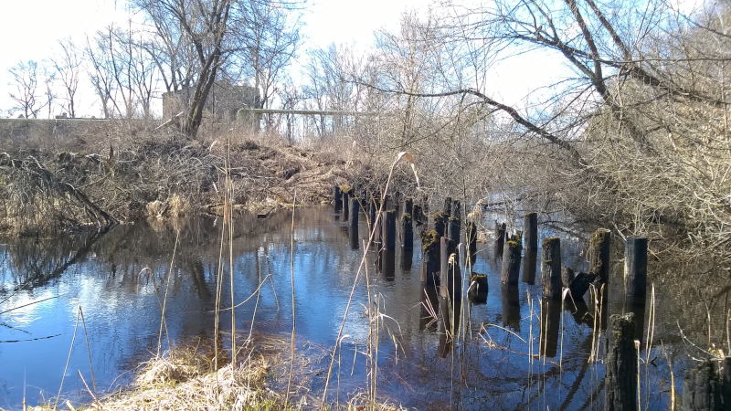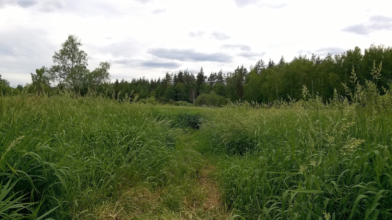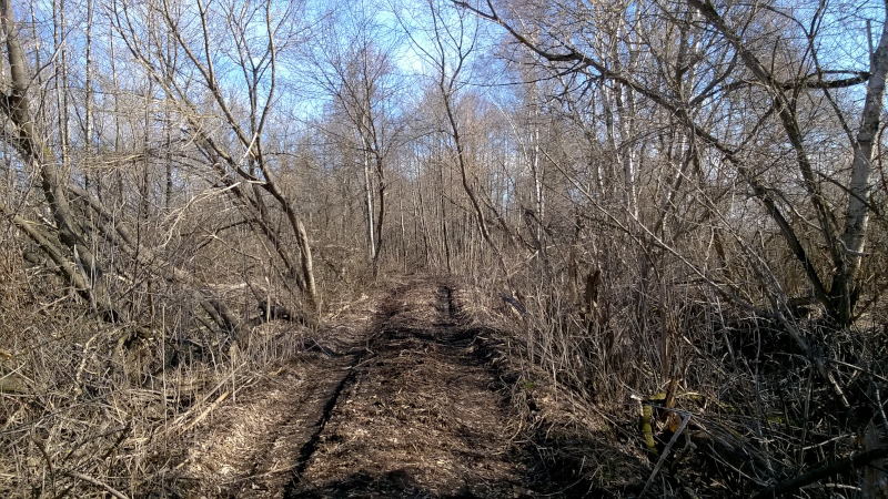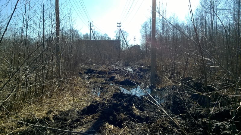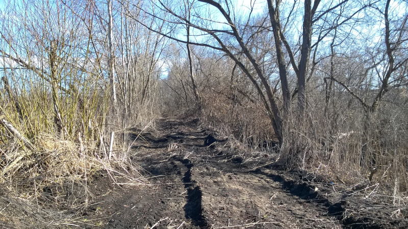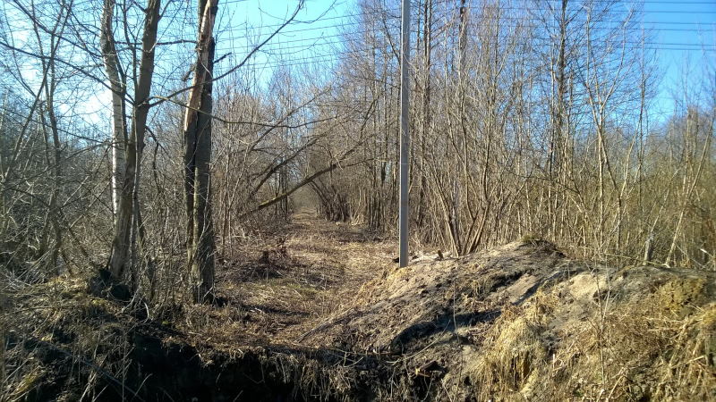 Вчера так и не выехал, а сегодня аж два захода. До обеда к тропке в районе завода добавил не большой крюк. Сначала хотел воспользоваться готовой(старой) тропой. Там и через канаву между водоёмом и узкоколеечной насыпью есть готовый проезд