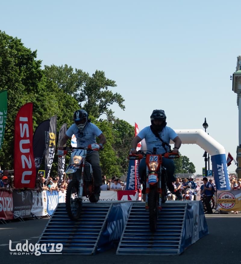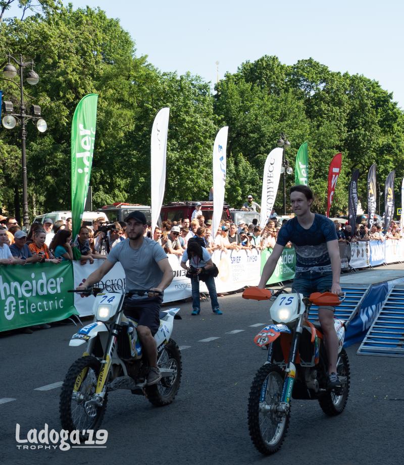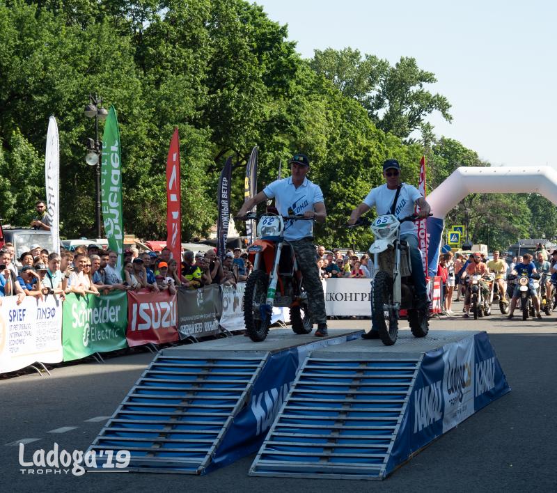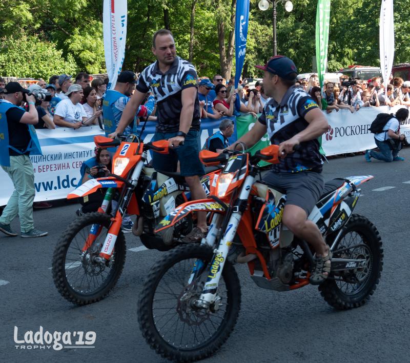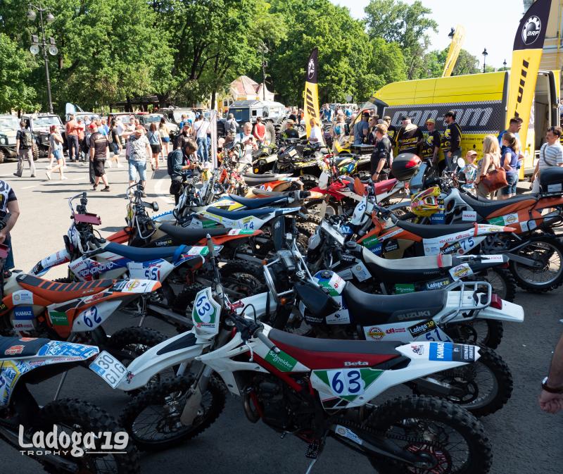 Будет много фото, если кого смущают логотипы, прошу понять и простить, это условие организаторов. Ранним утром повесил на мот две переметки, сумку с палаткой и канистрой и начал движение в сторону Казанского собора, где намечался торжественный старт гонки. Немного покрутился с поворотами, и в конце выехал прямо к автобусу "Пресс-службы", сразу же столкнулся нос к носу с одним из оргов гонки, Дмитрием и свои другом Сережей, который приехал проводить старт, никогда не пропускает, впрочем они все там почти родственники. Овчинников и Скобелев были пока в легком мандраже и сразу попали в прицел моей камеры. Грядка мотоциклов перед собором, снимаю ее, и ищу своих друзей, которых я видел в списке заявившихся на гонку! 1. 2. Евгения Тихомирова сложно не заметить в толпе, и он видит меня, улыбка в камеру. Вижу руководителя мото-зачета Сергея Киселева, в свое время мы как то даже общались про мотоциклы, это можно сказать его детище, в которое он вкладывает огромное количество времени и сил, и конечно прокладывает трассы и точки будущей гонки, адская работа если честно. Перемещаюсь в шумящей толпе, и замечаю, но , но, это как то я не ожидал, внезапно, Леву, и Алексея, вот это поворот событий, как говориться "слона" то и не заметил. Команду провожают в путь! "Собакин" смотрит на сточенное колесо моей "Собаки" Начинается торжественный старт, участники командой заезжают на стартовый подиум где объявляют их категорию, и стартовые номера, пафоса конечно через край, но выглядит красиво, что говорить. 1. Лев и Алексей, постоянно вижу парней в участниках "кантри-кросс" BRCup. 2. Следущие спортсмены в категории "Спорт", этих ребят не знаю. 3. Фины, очень позитивные, как я понял они не пропускают ни одной Ладоги. С подиума любят съезжать задрав ноги, Барышни непонятно с какими "Венками" Эстонцы, очень спокойные и расслабленные. Едут и о чем то трут между собой. На них Категория "Спорт" закончилась. Поехали "Адвенчеры" Карасев и Тихомиров, один "стантер", заднее колесо наше все, второй "эндуро", у Жени своя "Эндуро" школа, с прокатом, трассой, кстати очень позитивно, и добротно, у нас в лен-области, "Крутая-Гора", рекомендую к посещению. Сузуки "Джебель" !!!!!! Следующая команда, как я понимаю они второй раз. Еще одна команда. Последней шла команда в категории GT-moto Торжественная часть с мото завершилась, я договорился с парнями, сбросил в машину "шмурдяк", канистру с бензином, самое необходимое положил в переметки, мой путь лежал в Путилово, это по мурманской трассе, в тех местах есть старый карьер, где будет проходить этап категории "Спорт" на трассе проложенной Андреем Коробовым, в простонародье "Коробов-Штрассе". Двигаюсь по набережной в сторону мурманки, обгоняя судейские машины, погода великолепна, солнышко, мне кто то рекомендовал зонтик, если честно хочется снять куртку и ехать в футболке, реально жарко.) На мурманке ремонт дороги, но движение с утра достаточно свободное, в какой то момент догоняю целую веретеницу авто, скрывающуюся за горизонтом, иду по осевой, мне нужно прибыть на место, и отсечь точки съемки, медленно, все так медленно, не понимаю почему так медленно идет поток.... И в какой то момент, этот просто фантастика, обогнав несколько авто вижу перед собой колонну "байкеров" на "швабодках", "шпротах" и прочих "стидах" которые идут колонной заняв всю полосу, прямо как "тевтонский" клин