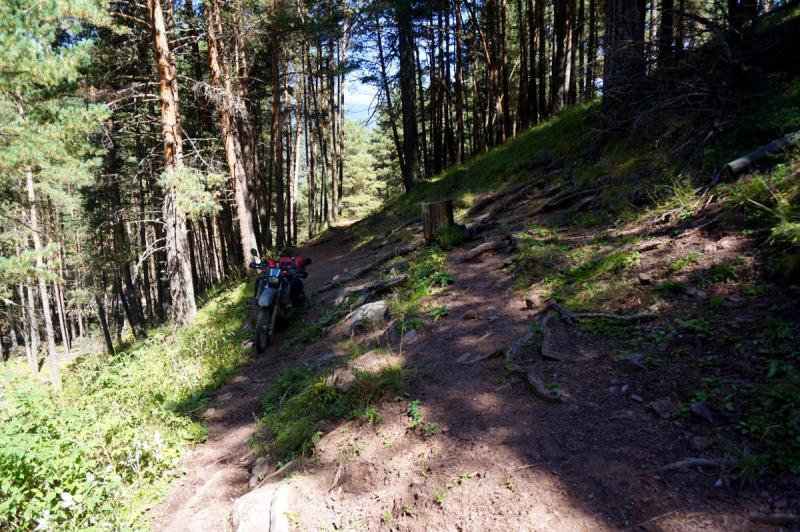 Читал в одном отчёте что группа прошла перевал МухУ с запада от Красного Карачая до Теберды, без всяких комментов про трудности. Намедни решил повторить подвиг; правда проводник на турбазе Аксаут (домики 250р.) сказал это скотогонная тропа, много бродов, есть участки где надо толкать. В результате я проехал по тропе немного и понял, что одному с грузом и больной рукой здесь нечего делать, типичная спортивная трасса хардэндуро, крутой склон, корни, камни...