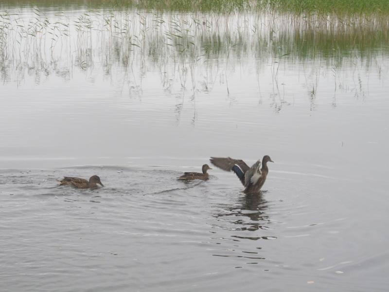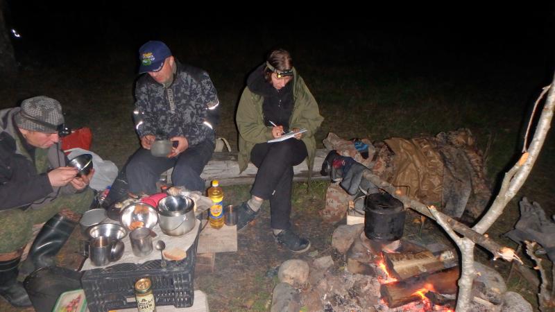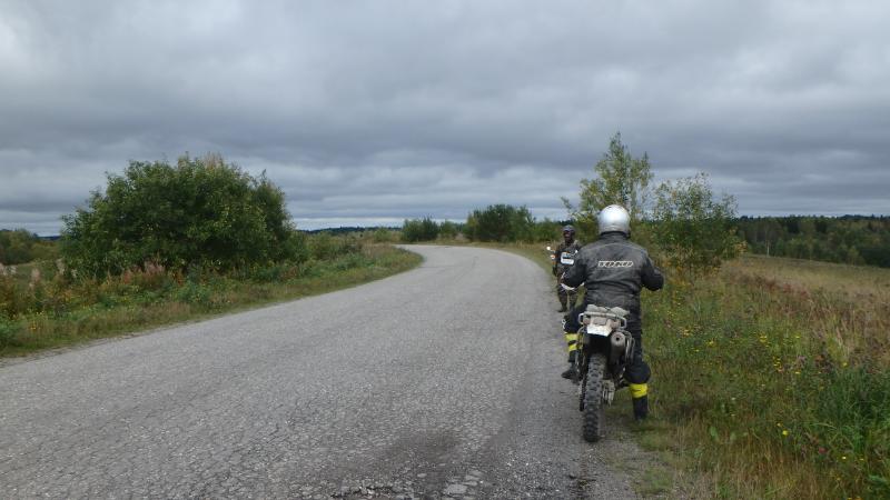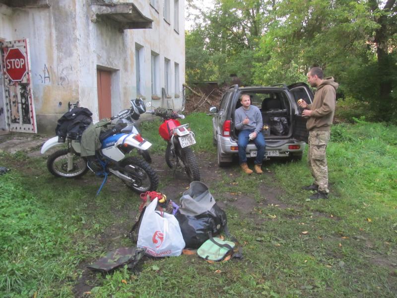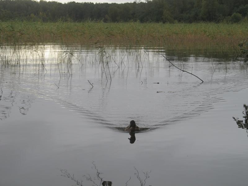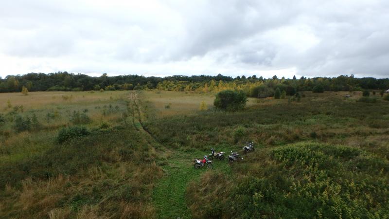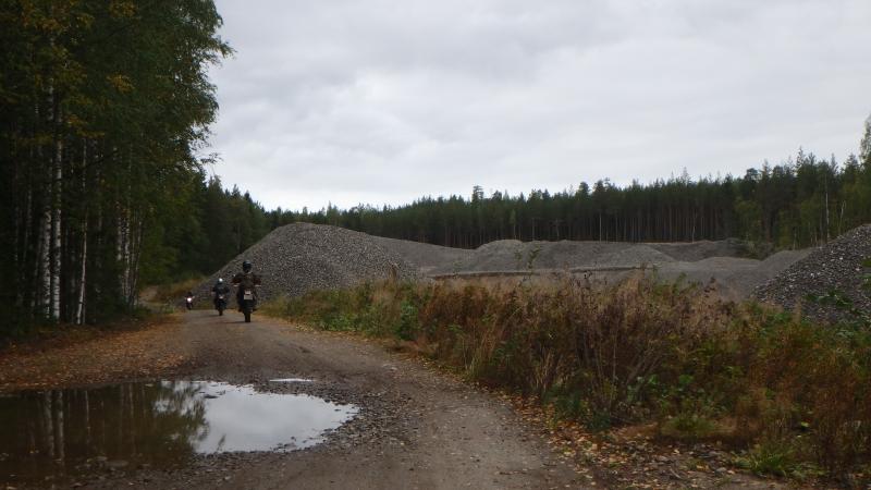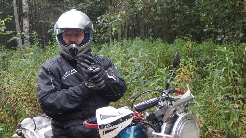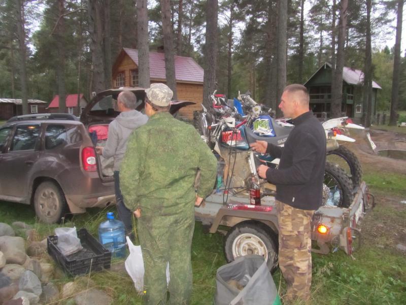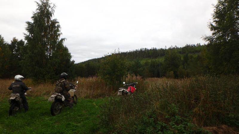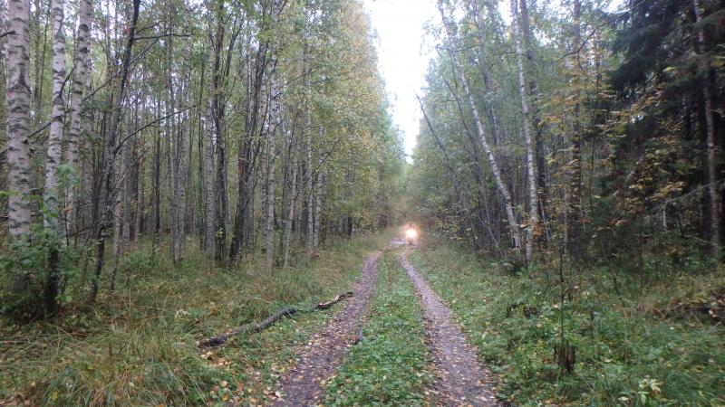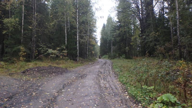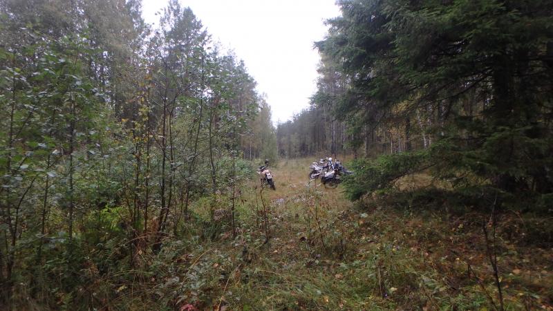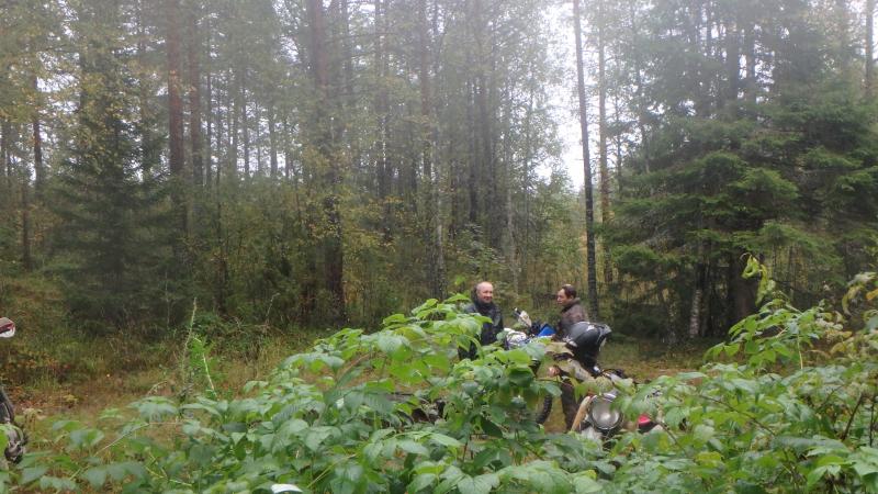 Раннее чудесное утро. Встала первая. Ромка вылез следом минут через 30 и мы поплыли на рыбалку. Я снова отобрала вёсла, хотя на этот раз Ромка уже не был против. Видимо оценил все прелести того, что не нужно грести самому Стало заметно холоднее. Рыба сегодня куда-то ушла и клевать совсем не хотела. Поплавав достаточное время по озеру, мы вернулись на берег без добычи. Чай. Завтрак. Вчерашняя уточка пришла составить нам компанию. А прямо перед выездом в лагерь пришла ещё и белочка Последние приготовления и можно выезжать. 13:04 – выезд. Мы снова без экипа, только шлема и перчатки, на ногах резиновые сапоги. Ну, и естественно, дождевики. Хорошая погода, вроде и ветерок есть, но не пронизывающий, прохладно, но одновременно по-осеннему тепло. Ближе к вечеру снова похолодает, не оставив и следа от дневного тепла, а пока мы все наслаждались свежестью, отсутствием дождя и насекомых. Отсюда настроение у всех гораздо лучше, и всё вокруг воспринимается позитивнее, чем вчера, хотя казалось бы куда ещё лучше? Виды и дорожки сегодня были более располагающими. Начало пути было широким скоростным грейдером, на которым каждый получил несравненное удовольствие. Делаем короткую остановку, увидев за обочиной памятник. Нам с Саней хочется посмотреть поближе. Отправляемся дальше. Дорога продолжает, то петлять широкой лентой, то уводить по прямой вперёд. Какой же кайф было просто крутить ручку и лететь вперёд, по широкой полосе окружённой лесом... И погружаться, как можно глубже, как можно дальше в него. На карьере развилка. Сначала отправляемся посмотреть на залив в Узкие Салмы. Едем в привычной последовательности, я за Саней. Замечаю, что заднее колесо у него, кажется подспущенным. Доезжаем до красивого места, так и есть – пробито. Ромка идёт рыбачить, и почти сразу ловит двух окушков. Мы с Женей созерцаем красоты и как Саня воюет с камерой Саня от усердия сломал насос Рома бросил рыбалку и примчался его чинить со всеми заклинательскими словами Пока камера приводится в должный вид, болтаем. Саня просит его подстричь. У Ромки с собой в машине есть машинка для стрижки. Сижу, размышляю, не выбрить ли ему на затылке слово HONDA или всё же не стоит приводить в действие коварный план... Разделавшись с камерой, и осмотрев местные красоты ещё раз, возвращаемся обратно к карьеру, чтобы уйти на другую тропинку в Вянишполе. На одном из отрезков я умчалась вперёд, а когда заметила, что ребят уже давно не видно, остановилась подождать их. Атмосфера леса со своими звуками, запахами, затягивала и манила погрузиться в неё ещё больше. Я стояла и впитывала её всем, чем только получалось 5 минут.. 10... 15. Я уже начала волноваться за них, и стала разворачиваться обратно, как услышала вдалеке звуки мотоциклов. Оказывается они заметили с дороги где-то в лесу небольшую построечку и заехали её посмотреть. Больше всего это по их словам было похоже на какой-то схрон или погреб. А недалеко от него были остатки видимо подобных этому. На каменном карьере Женя показал мне медвежью кучу, и если раньше я их не замечала, то теперь мозг знал, что нужно видеть и начал замечать их. А по дороге их было не мало. Я всё глазела по обочинам вглубь леса, надеясь увидеть вдалеке бурого жителя леса, но он нам так и не показался. Ребята этому были только рады. Теперь наш путь пролегал через лес, по более узкой тропинке. Краски 