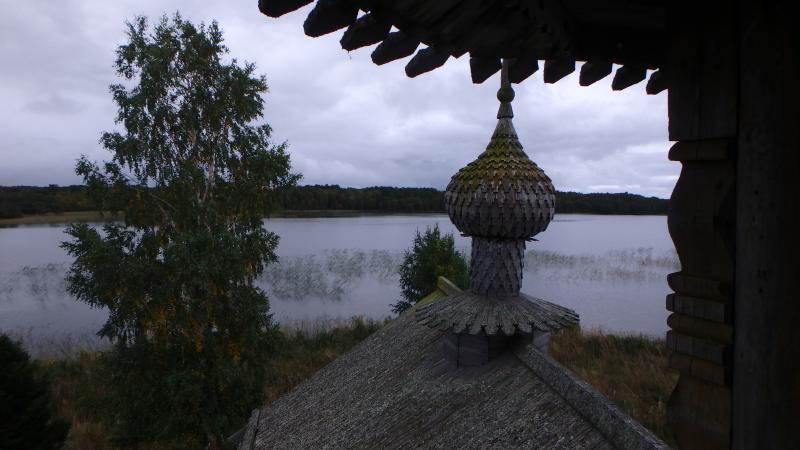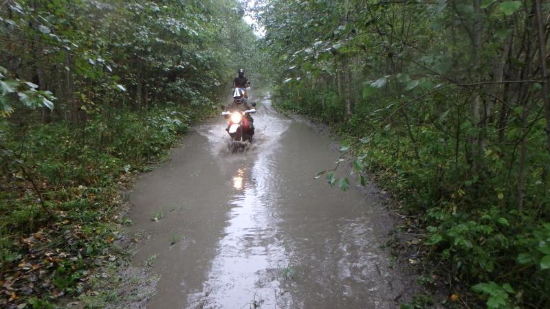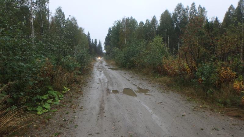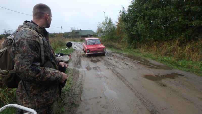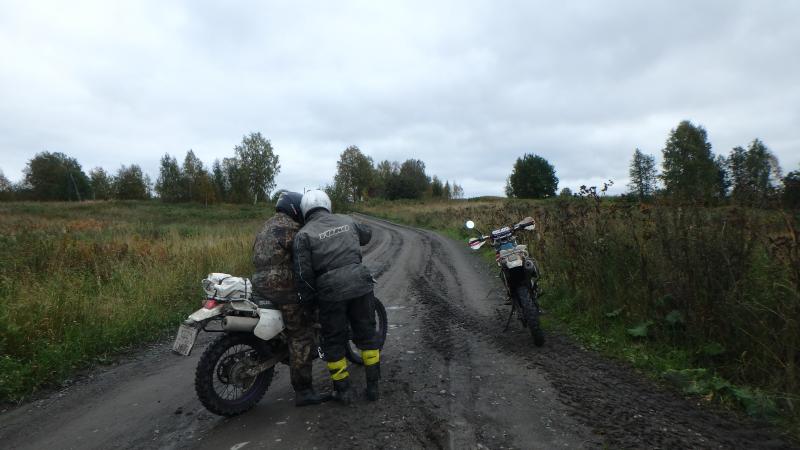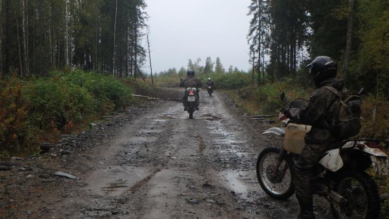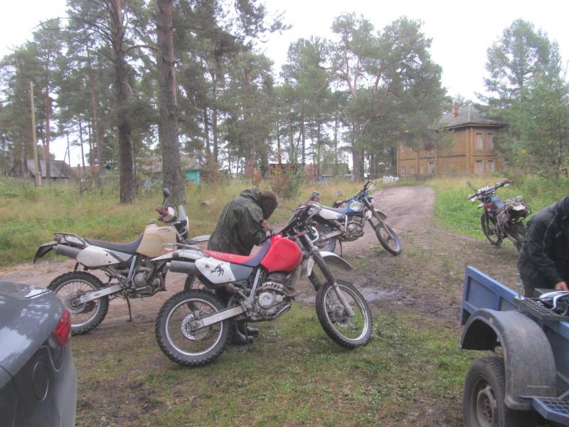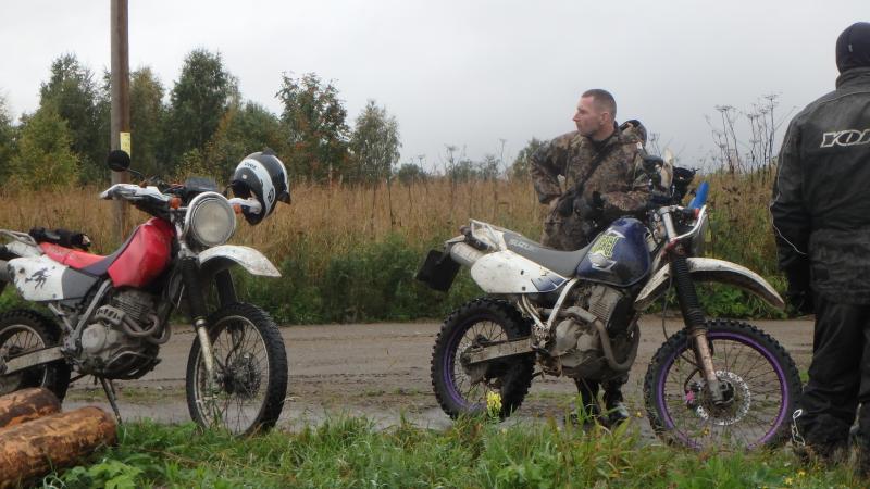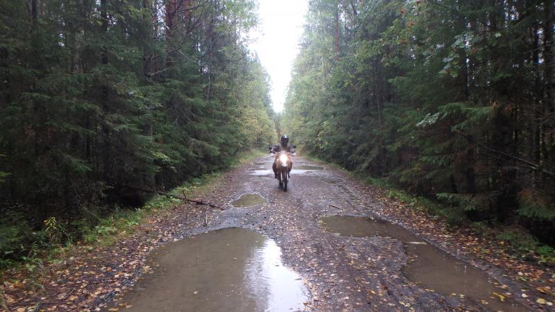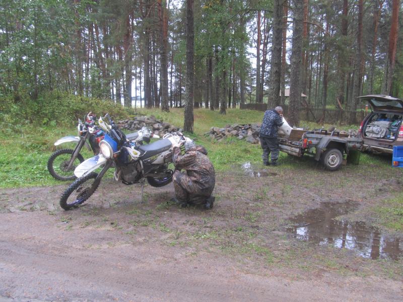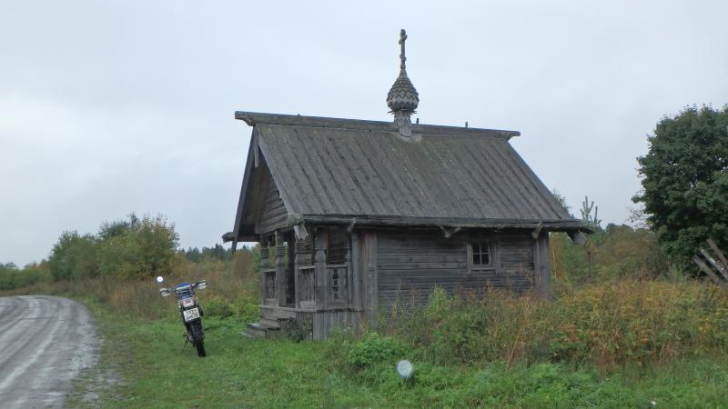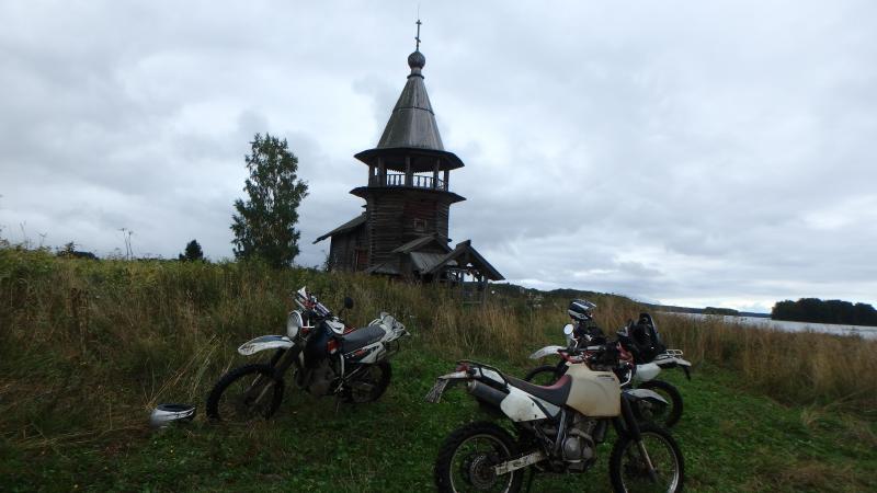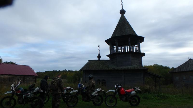 Встала рано, в шесть с небольшим. Дождь до сих пор идёт. Только из полноценного сильного ливня перешёл в уверенную крупную морось. Прохладно, но видимо я действительно стала привыкать к холоду, и температура ощущалась теплее, чем вчера. Хотя, возможно немного потеплело. Саня дрыхнет. Ромка объявил бойкот, отказавшись в дождь и рыбачить, и вообще вылезать из палатки. И только Женя на мой зов вышел из палатки и составил мне утреннюю компанию, да и то ближе к девяти. Как только мы перетащили полевую кухню в сторону, под тент, дождь усилился. В палатке остался только Саня. Ромка всё же вылез. Прогноз погоды обещает дождь на всю неделю, но мы не падаем духом и настроением: дождь, так дождь Саня присоединился к нам выспавшийся и довольный, и ни дождь, ни ветер ему не мешали довольно улыбаться. К 11:30 вода падающая с неба всё же утихла, но сильный пронизывающий ветер продувал насквозь. Очень холодно. Я развлекаюсь тем, что троллю форум, в красках рассказывая, что у нас жара, и что на Онегу нужно обязательно брать купальники. Ребята помогают. Весело. На душе становится теплее Нашествие лягушек с дождём только увеличилось. А вчера ещё и мышка к нам прибегала. Хотя кроме меня её снова никто не видел Место, где мы стоим лагерем очень живое: птицы, мыши, лягушки, белки, утки, рыбы, светлячки. Ещё и собаки с котом заходили Все уже с самого утра были настолько замёрзшие, что проскочила странная мысль сделать день перерыва и остаться в лагере. Но естественно никто в эту безумную мысль не поверил и не принял её в серьёз. К моменту окончания нашего завтрака, дождик прекратился, мы утеплились и выдвинулись к точкам, которые не успели посетить вчера. Перед стартом Саня и Женя на всякий случай доливают себе бензин. Так же на смазке цепей не забывают поиздеваться над Хондой, на этот раз из-за того, что она отказывается самостоятельно крутить колесо стоя на подножке и облегчить тем самым смазку цепи суровым эндуристам 12:30 – выезд. Первое, что делаем, едем искать срезку на выезд из посёлка, чтобы снова не ехать по асфальту. Грейдер оказался очень приятным, а дорожка красивой. Еду сразу в очках. Всё видно чётко Сегодня было особенно заметно, что в этих местах много рябины. Она своими красными гроздьями создаёт яркий акцент среди зелёной и жёлтой листвы. А прошедший дождь придал тихому лесу удивительную свежесть. По дороге подъехали посмотреть озеро Большое Леликовское. Вода чистая, прозрачная. Остаёмся здесь на какое-то время и просто смотрим на озеро. Почему-то все залипли. Видимо магия места Едем дальше. Лес меняется, от полностью хвойного, до смешенного и лиственного. Офигенный грейдер с большими, но не глубокими лужами. И настолько он был хорош, что это превысило моё желание не промокнуть, и просто спровоцировало меня ради удовольствия и красивого фото полетать по лужам на скорости, как я люблю, но уже делаю не так часто, как хотелось бы. Видимо Да и надеялась полностью просушиться после веселья на ходу. Фото, как всегда не получилось При езде от мороси на очках появляются капли и я всё же снимаю очки: видеть дорогу сейчас гораздо важнее, чем рассматривать очертания травинок и листочков Едем смотреть церковь. Широкий грейдер постепенно начинает сужаться и превращается в небольшую дорожку с колеями, но вполне укатанную. Часовню замечаем не сразу. Саня пролетает хорошо впер