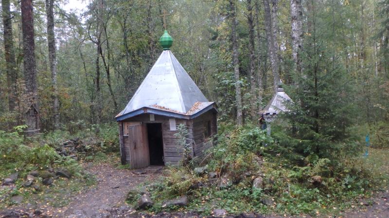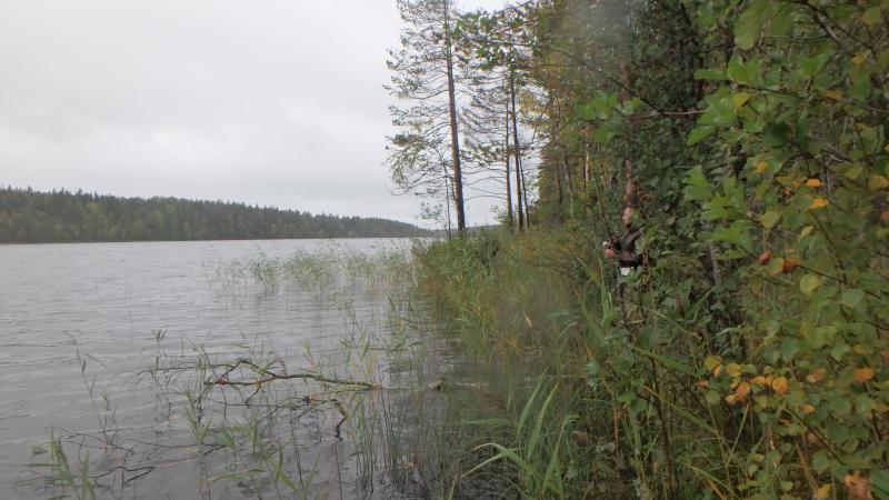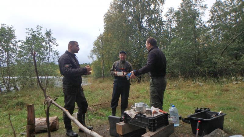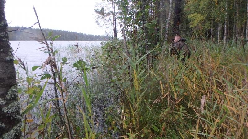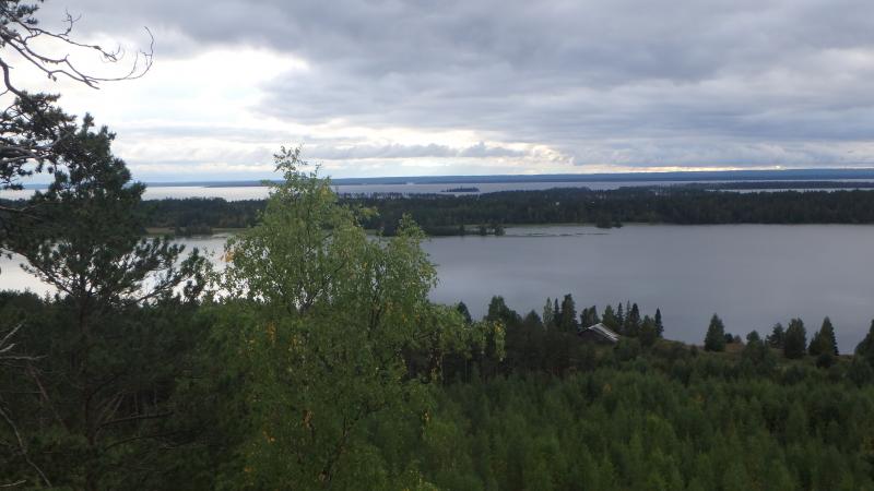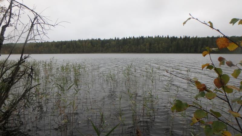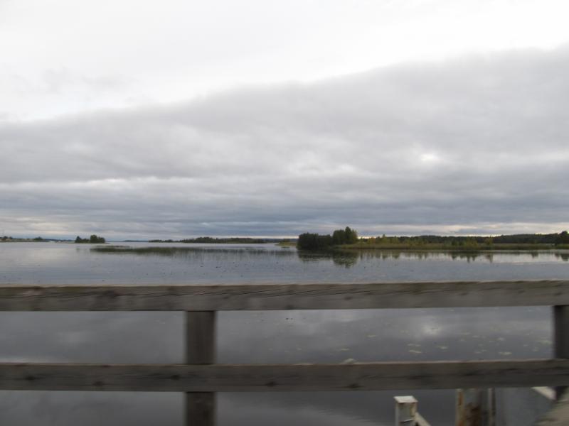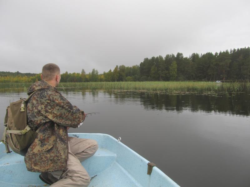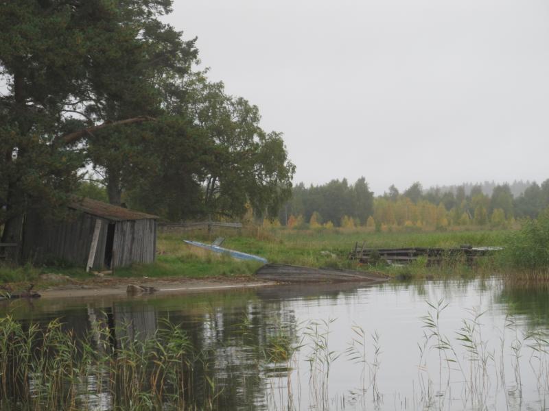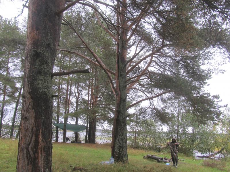Подъём в 5:50. Наши ребята должны были в 6 уже быть в гараже, чтобы собраться. То, что мы упаковались с вечера, позволило нам поспать на час подольше. 7:35 – выезд из гаража. Женя и Саня всё же стартанули чуть раньше и нам предстояло их догнать. В 10:00 не доезжая до Лодейного поля, где у нас планировался совместный завтрак, влупил сильный ливень. Но ребята нашли место – придорожная беседка на обочине от дороги. Радостная встреча, шикарный завтрак от ребят. Обсуждение ближайших планов. И в путь! Уже по традиции Женя за несколько месяцев до похода штудировал различные отчёты, статьи и собирал информацию о местах и направлениях, составляя максимально продуктивный и интересный маршрут на весь поход. Было не мало версий похода, но в итоге всё получится так, как изначально никто не планировал Перед въездом в Карелию дождь прекратился, на горизонте виднеется небольшой просвет, а облака над нами уже не тёмные, а светло-серые, можно сказать дымчатые. Муромка петляла между осенними пейзажами, оказываясь то безлюдной, то откуда-то появлялось скопление машин и так же внезапно рассеивалось. По обочинам много грибников: там и тут оставлены машины. Прохладно. Мне в машине снова не весело – жутко болит голова. В очередной раз пытаюсь понять почему на меня так действует эта машина, но оставляю эти попытки и стараюсь сосредоточиться на процессе езды и на видах за окном. Ребята захватили с собой игрушки, так что нам с Женей было чем развлечься: Ромка и Саня матерились на окружающие машины, которые «не едут», а мы с Женей по рации делились впечатлениями от услышанного 15:03 – сворачиваем к Медвежьегорску. 16:00 – слева открывается вид на озеро Онега. Проезжаем мимо шунгитового рудника, решая заехать на него на обратном пути. И первая остановка – Царицын Ключ. Просторы вокруг радуют, дышится полной грудью. Идём к источнику. Набираем с собой воды, ледяной и очень вкусной. Ребята болтают, а мне захотелось немного пройтись. Топаю по направлению к дороге и всё внутри меня радуется тому, что мы наконец-таки выбрались, поход начался. Пока мы были здесь, выглянуло солнышко, казалось, что пасмурное небо улыбается Едем дальше. Вдали видим Яндомозеро, на котором мыс делит озеро практически пополам. Сразу хочется предупредить и извиниться за качество фотографий: учитывая погодные условия нашего похода и непрофессиональные аппараты, далеко не все фотографии получились яркими и чёткими. Но что есть, то есть. Едем дальше. Красивый вид с небольшого мостика уже на подъезде к конечной на сегодня точке: 18:10 – прибыли в небольшой посёлок Больничный. Мы на месте. Договорились о стоянке с владельцем базы отдыха. Хозяин Александр, очень хороший и отзывчивый человек. Машины мы оставили перед домом, а сами отметили приезд и перетащили нужные вещи на место будущего лагеря – на берег озера, в сосновый бор, располагающийся за домиками. Вокруг не слишком обширная территория огромных сосен, на берегу озера, вдали от дорог. За соснами начинаются лиственные деревья и кусты. На озере, недалеко от лагеря, причал. Вокруг тишина, разбавляемая лишь голосами птиц и шутками ребят. Запах хвои, травы, свежести от прошедшего ранее дождя, а так же едва уловимый аромат грибов и земли. На самой территории гостевого дома (мы стояли в стороне) тихо и безлюдно. Постояльцев здесь не много, и все они приезжают сюда за ти