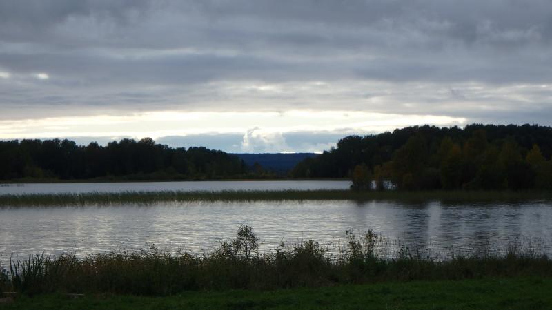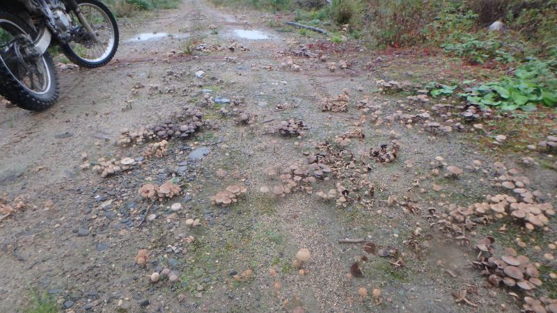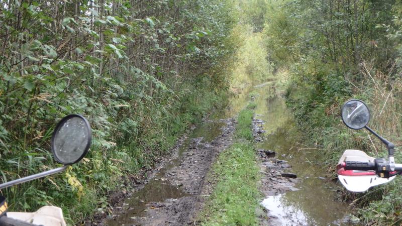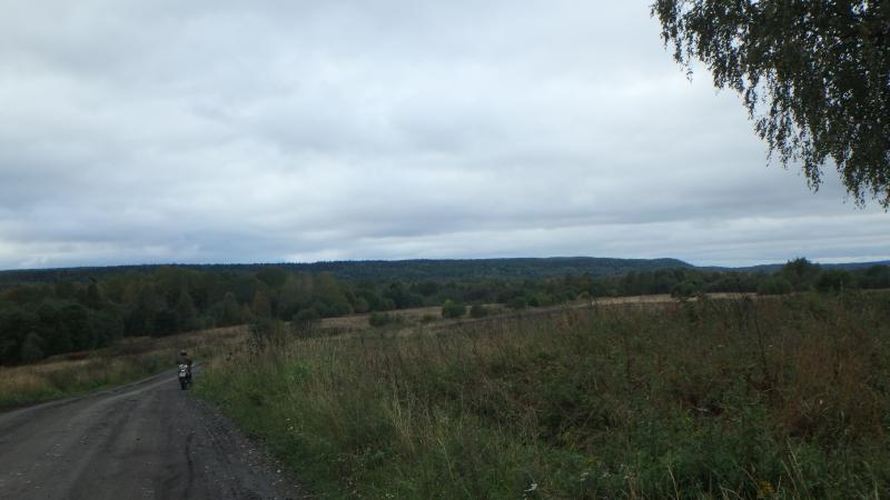 Едем дальше на Черкасы. Места вокруг красивые, впрочем, разве может быть иначе? А грейдер просто великолепен! Ровный, с лужами и небольшими плавными ямами. Все один за другим с удовольствием проносимся по лужам, создавая фонтаны брызг. Всё равно все уже мокрые. Ребята встают в стойки, а мне лень. Кайфую сидя. Дороги вели нас и лесом, и полем, после которого снова неизменно начинался лес. Атмосфера вокруг своеобразная, но притягательная. Краски природы вокруг не очень разнообразны, но благодаря дождю очень насыщенны. После поворотов на развилках приезжаем мы не в Черкасы. Вместо этого, проехав по длиннющей гати с настолько хорошей насыпью, что саму гать особо никто и не почувствовал, да и гатью это было сложно назвать из-за верхнего покрытия, выезжаем на просторы. Дорожки уводящие в даль приводят меня в восторг! Среди лесов это явление весьма не частое. И следуя по змейке дорог мы приезжаем... в тупик. Перед нами конец дороги и не проезжаемый лес Ребята встали втроём вряд, я остановилась позади них. Ромка ржёт в голос, потому что с Саниной фразой: «Мы заехали не туда» он как раз смотрел на Женин мотоцикл, на котором написано GPS версия Зато какая красота вокруг! На всей дороге, а не только на обочинах, по которой мы ехали, просто ковёр из поганок и каких-то других ядовитых грибов. Пусть грибы и не съедобные, но выглядело это очень интересно. Даже жалко было давить их колёсами. Такого ещё нигде ранее не видела. Вокруг красиво и тихо. Смотрим карту, понимаем, что заехали не туда. Ну, наконец-то заблудились! Ну и судя по целым грибам на дороге, здесь уже давно никто не ездил. Возвращаемся немного обратно. С дороги видим неподалёку озеро. Решаем дойти до него, посмотреть. Мотоциклы оставляем на дороге, а сами пробираемся через непростой участок. Лезть приходится по склону, через высокую траву по сплошняком заваленному толстому ковру из поваленных небольших брёвен и прутьев. Этакий лежачий бурелом. Морось вроде утихла, но идти было очень сложно: ноги соскальзывали и проваливались между веток и брёвен. Главное было не торопиться и аккуратно выбирать дорогу, чтобы не подвернуть ногу. Взгляд обратно к дороге и мотикам: Фантастическое совпадение, но озеро оказывается третьим висячим озером – Мижозером, единственным из трёх, на которое мы даже и не планировали попасть. Но чудеса случаются, а случайности не случайны Озеро очень необычное, последние несколько метров до края болотистые, а потом сразу резко травяной обрыв и большая глубина. И снова, впервые вижу такое, можно сказать полное отсутствие берега: вот лес, вот болото и уже сразу глубокая вода. Вот ты стоишь на земле, а всего один шаг - и ты уже занырнёшь с головой под воду. Впечатляет и удивляет. А если пройди дальше вдоль озера, то болото постепенно исчезает и обрыв в воду уже идёт от твёрдой лесной почвы. Озеро окружено лесом, который уже начал менять краски более выражено. В низине и в лесу гораздо теплее. Тихо. Красиво. Само озеро вытянутое, большое, длинное, но по отношению к длине не очень широкое. Полностью окружено лесом. К берегам там и тут прибит топляк. Останавливаемся здесь для рыбалки и созерцания примерно часа на полтора-два. Ромка поймал окуня и первую за поход щуку. А пока Ромка занимался добычей ужина, мы созерцали окрестности. Вдоль озера видна протоптанная тропинка, по всей видимости бобри