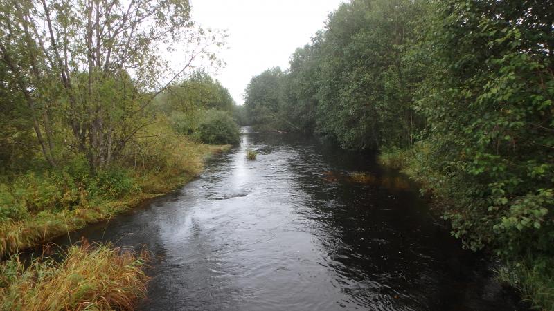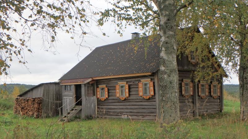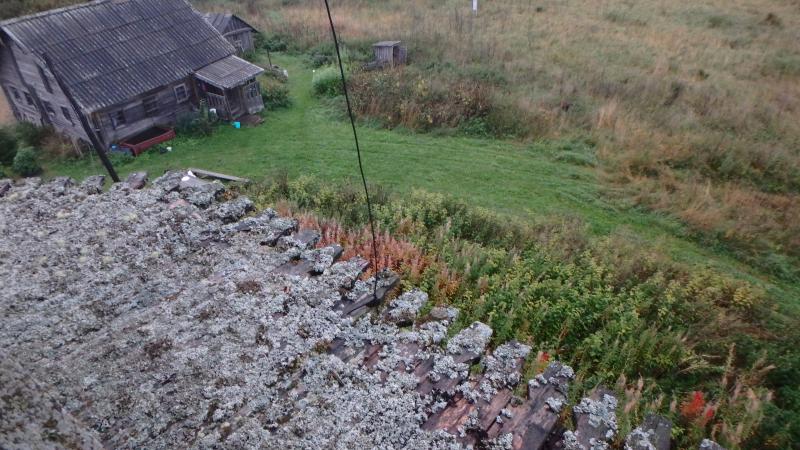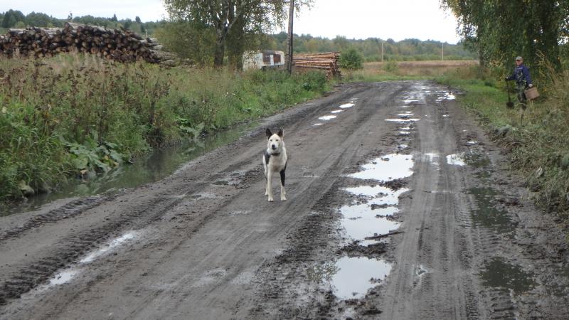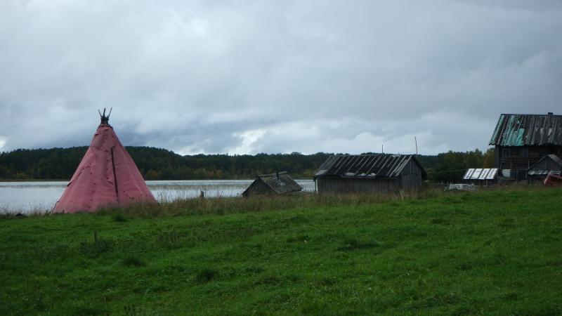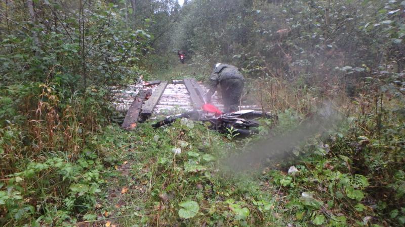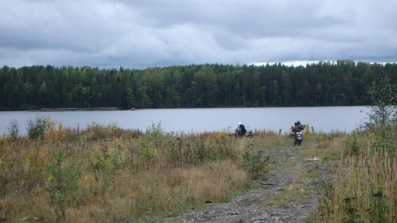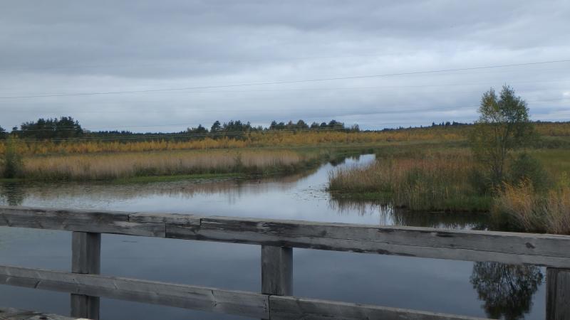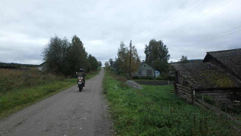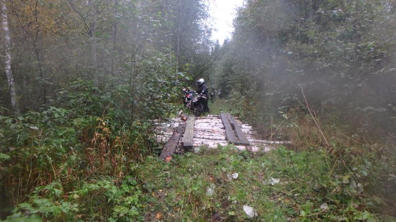Так как вчера допоздна сушили вещи, и спать пошли ближе к трём ночи, встала я на полтора часа позже желаемого. Очень не хватало этого утреннего времени в тишине и уединении с природой. Да и состояние было такое, словно я вчера до самого утра бухала. Не понравилось. Женя хлопотал по кухне, я ушла писать заметки по вчерашнему дню, т.к. вчера до них просто не дошли руки. Саня с Ромкой вылезли из палаток последними. Завтрак. На улице немного теплее чем вчера, а самое главное нет дождя. Погода тихая. Хорошо. Делаем мотам ТО: Бахе смена масла, Ромкиному и Саниному Джеблам смена колодок. Смазка цепей. Мою ещё и подтянуть нужно было. Доливка бензина. Вчера я единственная переключилась на резерв. 12:30 – выезд. Дождя нет, но холодно. Однако экип для этого похода уже предрешён - в приоритете резиновые сапоги и дождевики. Догоняем вчерашний день, завершая маршрут, который не успели охватить вчера. Погода здесь очень переменчива. Утро было теплее, а к выезду похолодало и поднялся ветерок. Первую остановку делаем на мосту, через который проезжаем каждый день, дважды в день. Но уж слишком там красиво, чтобы в очередной раз просто промчаться. Моё колено сильно болит после вчерашнего рывка. Видимо чтобы удержаться на моте я сильно сжимала коленями бак и при наскоке на камень сильно его нагрузила тем самым. Поначалу думала надеть наколенники, но в последний момент передумала и замотала его длинным эластичным бинтом, т.к. он обхватывал и держал колено плотнее Торов. Первые несколько десятков километров ехала с опущенной выпрямленной ногой. Только так колено чувствовало себя более менее комфортно. Потом приловчилась сидеть почти на самом багажнике, так колено сгибалось по минимуму, но зато с поставленной на подножку ногой. Рулить было неудобно конечно, зато изгиб колена был минимален, не острее прямого угла. Спустя ещё пару километров я наконец-то поборола свою лень и встала в стойку. Ноге стало значительно лучше в таком положении. Ехали асфальтом, но по сторонам открывались очень красивые пейзажи: поля, озёра, лес, как располагающиеся вблизи, так и вдали, уходящие в горизонт. Едем асфальтом приличное расстояние, после чего асфальт сменяется плотной, хорошей грунтовкой. Просторы иногда скрываются ненадолго деревьями или большими кустами, но очень быстро снова предстают во всей красе давая нам рассмотреть всё, до чего дотянется взор. Вскоре справа нам открывается вид на Путкозеро, которое с виду ошибочно можно принять за реку, из-за его вытянутой узкой, но очень длинной формы. А спустя ещё несколько километров к этому виду добавляются домики. Почти доехав до «смотровой» площадки в посёлке Фоймогуба, по дороге видим ещё одну медвежью кучу. Как правильно заметил Женя, складывалось ощущение, что медведи специально выходят погадить на дорогу, чтобы попу иголки и трава не кололи Фоймогуба находится в низине, в южной части длинного и узкого Путкозера со скалистыми берегами, покрытыми лесом, в самом сердце Заонежского полуострова. Но ни на одной карте этого названия найти не получится - его там нет. "А всё дело в том, что раньше Фоймогуба представляла собой куст деревень - объединенную единым названием группу из ряда соседних поселений с одной общей церковью. Более 300 лет простояла церковь Успения Пресвятой Богородицы, построенная в 1631 году в фоймогубской деревне Патр