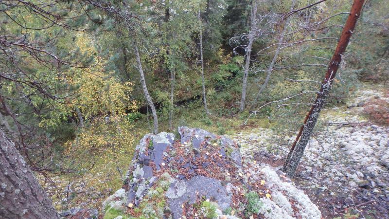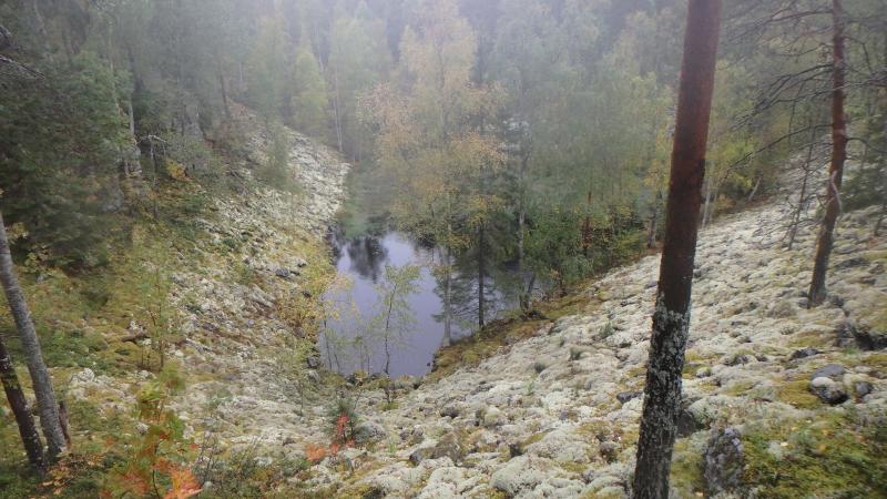 Едем дальше. Дорожка ведёт нас через поле, покрытое лёгкой туманной дымкой, дальше в леса. Следующая остановка у водопада на Мельничном ручье. Там же располагается ущелье Поповская Яма. Но сначала мы увидели не его, а небольшие участки небольших скал возле дороги. Другая же сторона была в густой зелени деревьев, кустарников и трав. Оставляем мотики на пятачке и дальше топаем пешком. Когда остановились, первым делом услышали звук шумящей воды. Здесь виды нам тоже открылись не сразу. Пошли на звук, раздавался он из-за ближайших деревьев и кустов, и идти приходилось сквозь густую зелень. А когда источник шума открылся нашим взглядом, оказался небольшим, но красивым водопадиком, весело сбегающим вниз. Вода прокладывала себе путь через густую траву, нависающую над водой, бежала по корням и каменистой скальной породе, которая через несколько метров уводила этот поток резко вниз. Осматриваемся вокруг, слушаем журчание воды, создающее аккомпанемент птичьим трелям и идём дальше. А там открывается удивительный и неожиданный для этой местности вид. Среди деревьев и обычного на первый взгляд леса скрывается огромное ущелье. Сейчас мы находимся на вершине скалы. На самый край подходить опасно из-за скользких камней и мха. А небольшой водопад, увиденный в самом начале, сбегая, образует внизу озеро. Местами заболоченное. Из которого так же выбегает не маленький ручеёк. Что нужно сразу отметить, так это то, что ни одно фото и видео (которые там сделать было не так-то просто из-за большого количества деревьев и невозможности объять всю красоту в одном кадре) не передаёт красоты, внезапности, удивительности и масштабности этого места. Деревья с этой стороны растут везде: наверху и на склонах скал, далеко внизу, и все они вытягиваются к небу, словно стремятся выбраться наверх, за пределы тех мест, поближе к солнышку. Но даже они, поражающие своей высотой, сверху кажутся небольшими зубочистками. Пошли вдоль края дальше, вглубь леса, дальше от дороги. Виды с каждым десятком шагов менялись, открывая новые рельефы. Встречается много сосен с причудливой формой ветвей. Края скал неровные, рваные. Скаты крутые. Где-то гладкие и ровные, а где-то с валунами и камнями. Что было неизменным везде, так это мхи и лишайники, покрывающие и скалы, и камни, и делающие их весьма скользкими. Пройдя не малое расстояние и дойдя до крутой горки, замечаю место, где можно спуститься вниз. И при аккуратности этого действия даже не свернуть себе шею. Предлагаю ребятам спуститься вниз и полюбоваться видами оттуда, а так же пройтись по дну ущелья. Мальчики не сразу, но соглашаются. Впрочем, выбора у них особо не было Я начала спуск первой, чтобы ни у кого не возникло желания передумать. Ребята ещё некоторое время смотрели на меня, видимо веря в то, что я передумаю, но у меня задача была иной, я хотела увидеть это место ещё и с нижней точки. Так что им оставалось только присоединится ко мне и начать спуск. И уже во время спуска виды на скалы и ущелье начинают меняться. Виды снизу значительно отличаются от того, что мы видели сверху. А точнее здесь мы увидели то, что не могли увидеть с вершины скал, потому что там весь вид закрывали густо растущие деревья. Так что спускались мы однозначно не зря. И после спуска вместо того, чтобы гулять низом обратно, мы находим куда ещё можно прогуляться и залезт