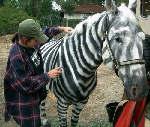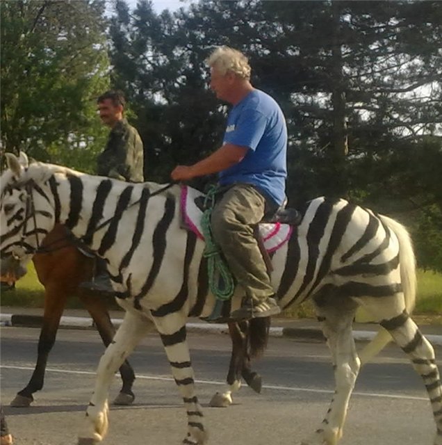 Ага! Лошади это крашеные. Не будет зебра работать. Это все равно что индейца в рабство оформить. Лично читал в "Наука и Жизнь" заметку с фото, где один техасский ковбой верхом на зебре. Написано было, что зебры тяжело приручаются, под седло их -типа, вообще невозможно, но вот у этого парня получилось. При этом его зебра считается лучшей ковбойской лошадью в штате, "ковпони" должна больше уметь, чем обычная верховая.-------------------- Мои видео по Джебелю-200 ( обслуживание и пр) здесь: ССЫЛКА.