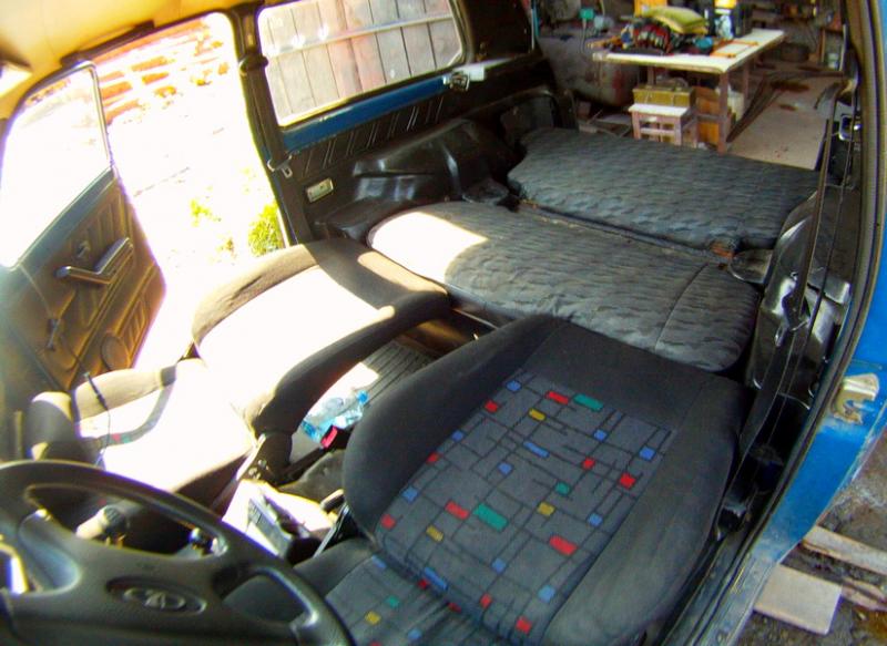 Поскольку ночёвки в машине на рыбалках практичекски норма, то я разработал такую "систему" - отсоединил спинку заднего дивана от сидушки, передние сиденья со снятыми подголовниками ставлю в один уровень с зщадним сиденьем и вот что получается -