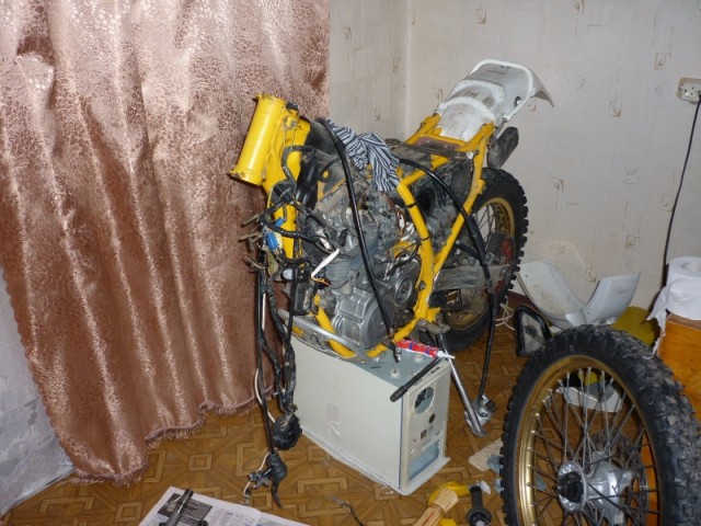 ![]() Вот что получилось. Осталось попробовать в деле. По переделке - не подошло вообще ничего кроме оси траверсы, всё остальное от DRZ400; колесо с осью и суппорт в сборе. По идее должно было обойтись 16-18 килоруб, но почта России и собственные неудачные покупки добавили еще 5-6 круб. Еще поставил трубу Jardine RT5 (от Кавы), чтоб из далека было слышно. Двигатель не трогал, ибо нефиг - пробег 3000км. Еще поменял подшипники в прогрессии, диски и колодки. Вот сижу, др.., пардон, жду тепла. :-)