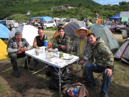 Я, конечно, собиралсь посетить НКЗ на джебеле, но за недлю до отьезда у напарника появились семейные проблемы и я решил, что поездка моя "накрылась медным тазом", но бог услышал мой плач и послал мне попутчиков в лице братьев Кличко, ой Кравченко(эндуро-кросс). Надо сказать что поездка на машине имеет свои преимущества. Во первых быстрее, во вторых загрузил стол, печку, воду, продукты и пр. необходимые в автономке вещи, особенно на таком авто как Пробокс. Выехали мы 22 в 16-30. и утром были на месте. Дорога ужасная. несколько раз отгибали диски(гнет на ямах). Молодеж гоняет..., я чуть не поседел за время поездки, но это отдельная история. Вообщем приехали, созвонились с Комсомольчанами, встали рядом и начали снимать стресс от поездки. К нашему приезду прошел циклон и близлежащая река извергала в залив тонны глины. Сам залив мне не понравился, мелкий, вода оч холодная и грязная. Но все сглаживала погода и царящая вокруг обстановка всеобщего счастья. Т.к. не все смогли привезти с собой стол и печь к нам начали подтягиваться соседи и жизнь начала налаживаться.